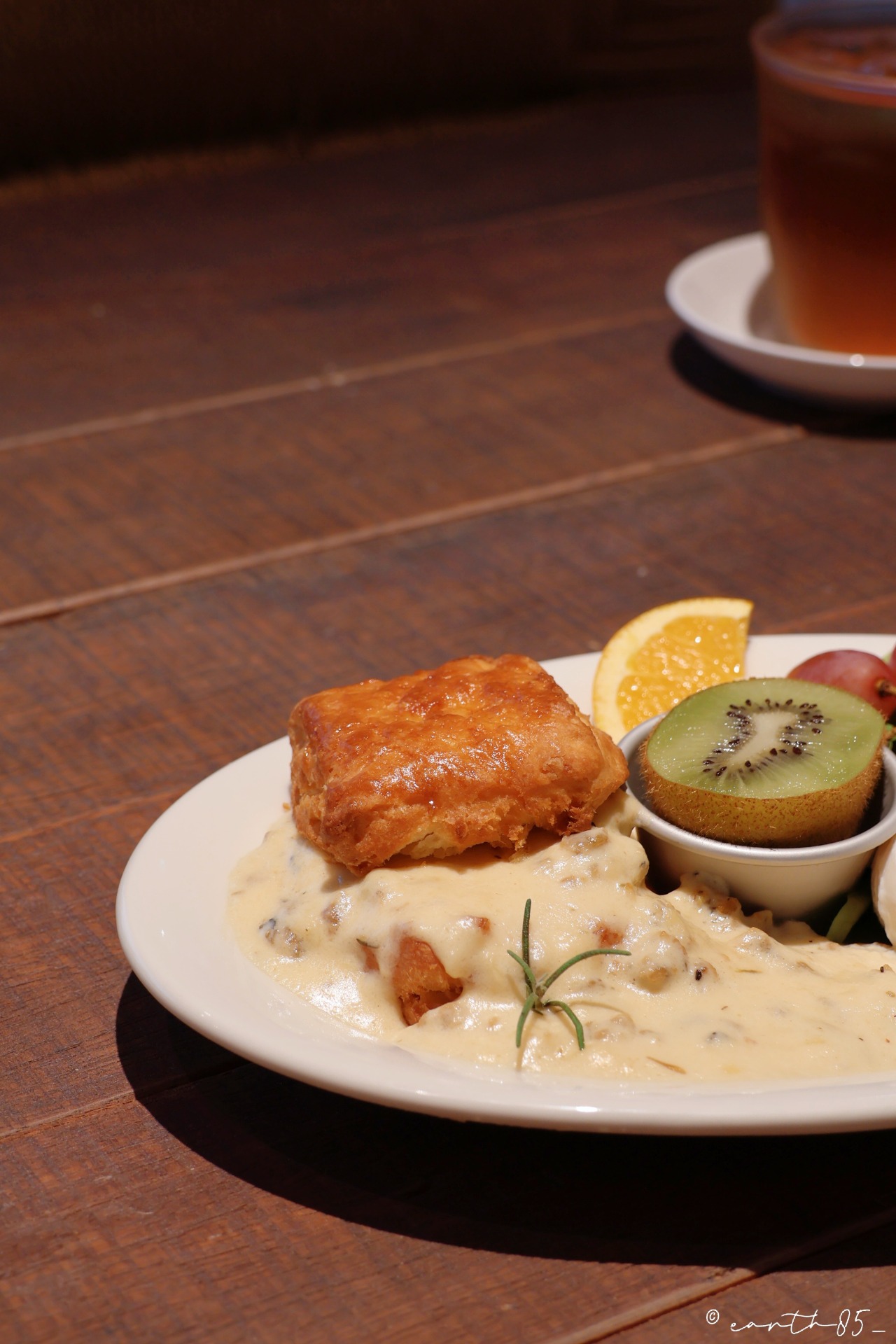 現烤酥鬆的比司吉搭配美式白肉醬,鹹香好吃,搭配一旁的水波蛋及生菜平衡的剛好。
