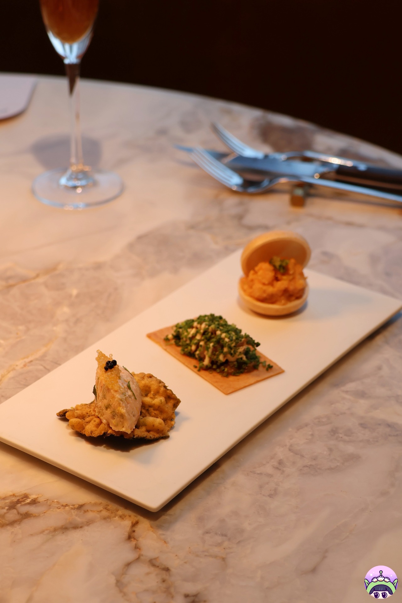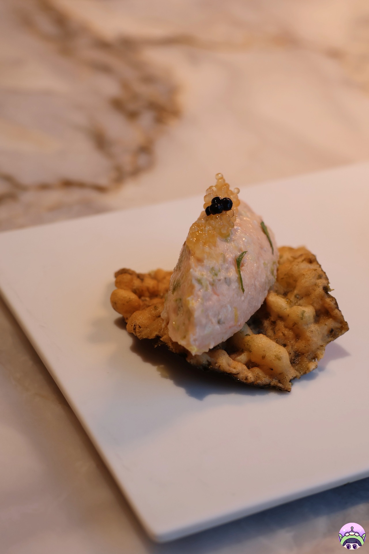 「 煙燻鮭魚奶油起司|海苔天婦羅」鋪上魚子醬與飛魚卵點綴,滿滿的海味精華。