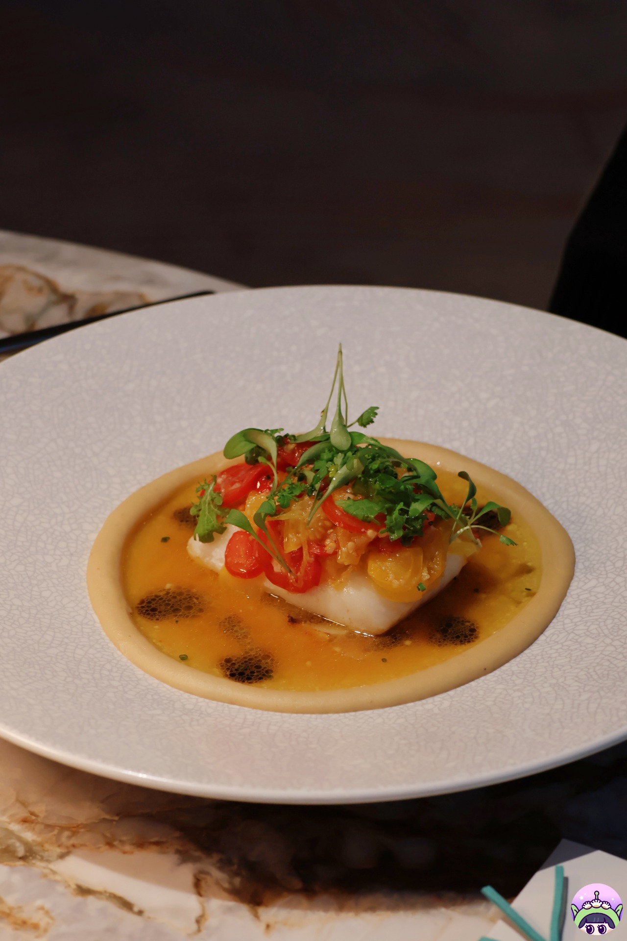 清蒸大西洋扁鱈搭配鷹嘴豆松子泥,酸甜感帶出鱈魚的鮮甜。