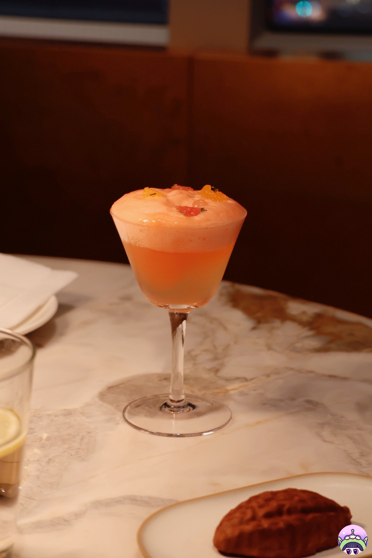 「香橙蜜桃冰粉凍」柑橘果汁與蜜桃泡沫非常細緻,酸甜解膩。